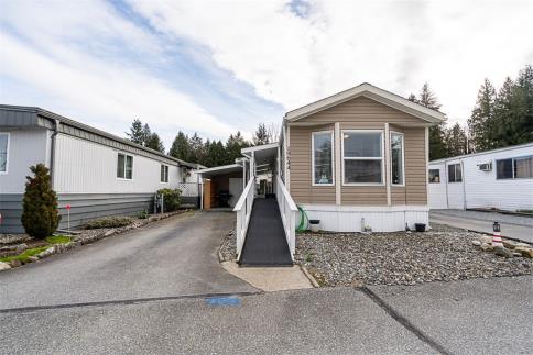 Welcome to this highly sought-after mobile home park. This well-maintained home is just 13 years old and features a spacious layout with vaulted ceilings. Offering 2 bedrooms plus a den and 2 bathrooms, including a full ensuite off the primary bedroom. The large kitchen and dining area showcase bright white cabinetry, and the comfortable living room is filled with natural light from multiple windows. Step outside to a covered patio deck leading to a low-maintenance yard. This home is wheelchair accessible and includes a large 18x9 workshop and an indoor swimming pool! Conveniently located close to transit and shopping—an ideal location!